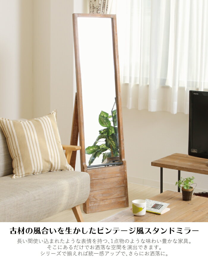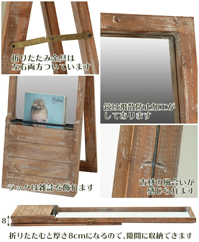 スタンドミラー 姿見 全身鏡 ミラー 鏡 全身 飛散防止 折りたたみ 折り畳み 天然木 木製 アイアン ミッドセンチュリー アンティーク 棚板 棚 ラック 収納 家具 北欧 古材 レトロ ヴィンージ