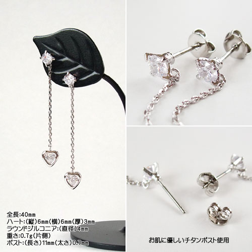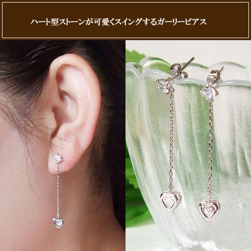ピアストップにはブリリアントカットを施したラウンドストーン、そこから細チェーンでハートストーンがスイングするデザイン! 動くたびに優雅に舞うように揺れ輝くジルコニアの透明感が爽やかで、ミドルレングスのシルエットが髪をまとめた横顔を上品な可愛らしさを演出してくれます♪