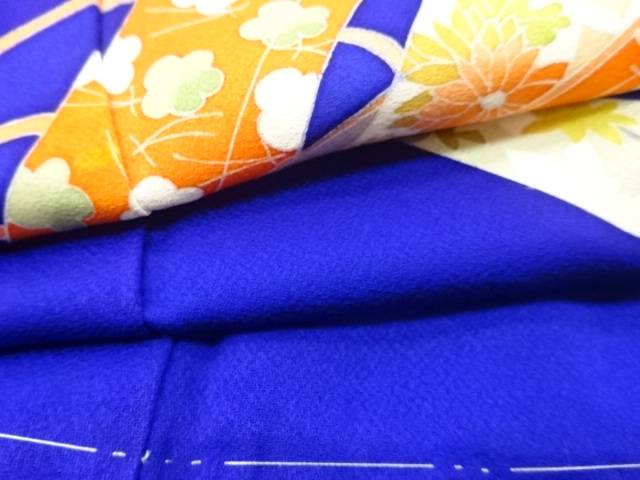 <着物サイズ>(単位:cm) 身丈158身丈(出し)11 裄64裄(出し)4 袖丈49袖丈(出し) 後幅30前幅24 つま下76 時代 現代(1989 - ) 状態 非常によい 素材 正絹 色目 青 【商品説明】衿は広衿です。